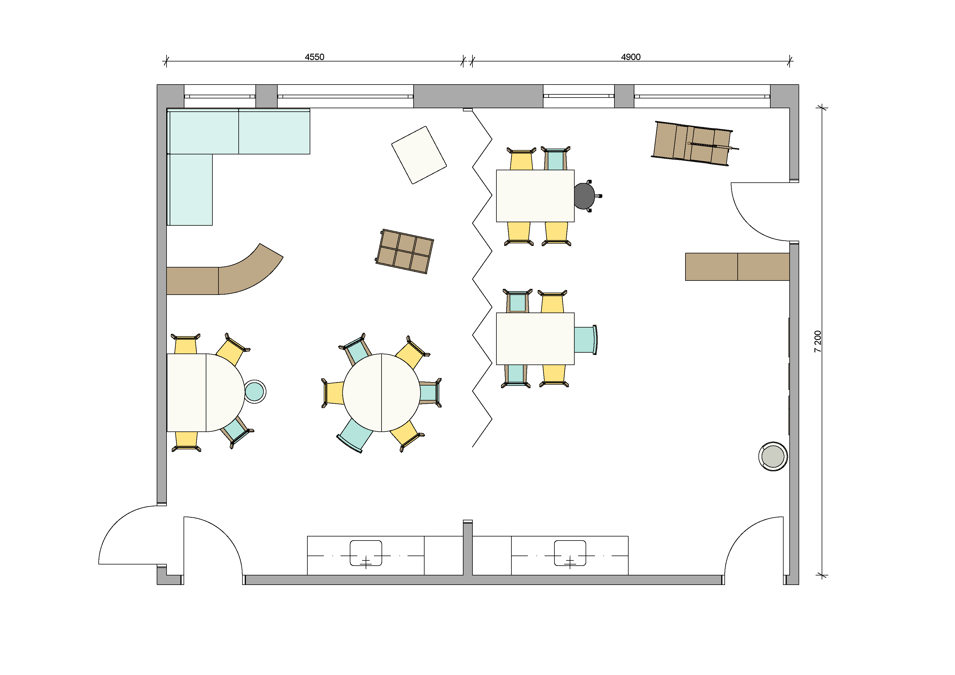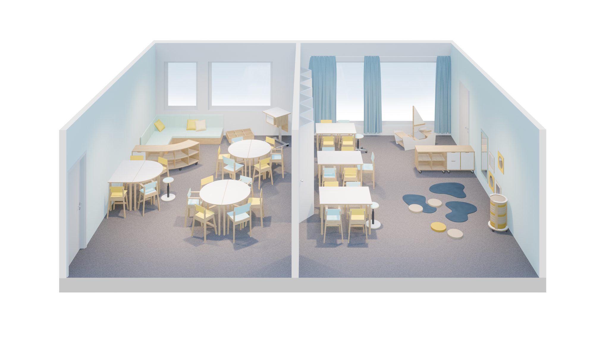 Muotopöydistä koostetussa ryhmätilassa on jokaiselle oma paikka ruokailua sekä arjen askareita varten. Muunneltavilla kalusteratkaisuilla taataan, että tila soveltuu monenlaisiin tarpeisiin. Pöytien ympärille jäävä avoin tila mahdollistaa monipuolisen tilan hyödyntämisen myös silloin, kun pöydistä halutaan tehdä pienempiä ryhmiä tai käyttää niitä yksittäin.