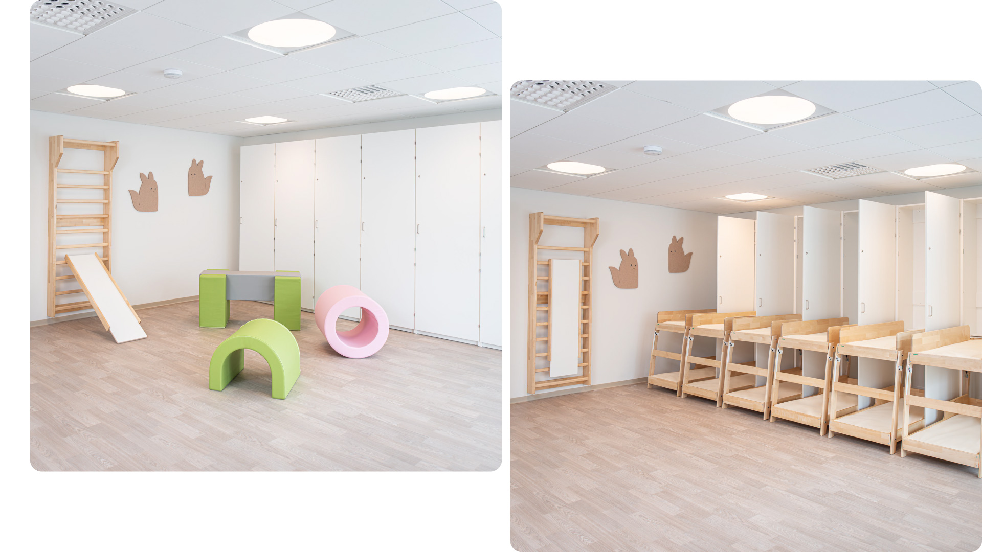 Bed cabinet solutions are an essential part of a functional daycare environment – they are both safe and space-saving. After rest time, the room can easily be transformed into a play or activity area, and for safety, the beds can be neatly stored away inside the cabinets.