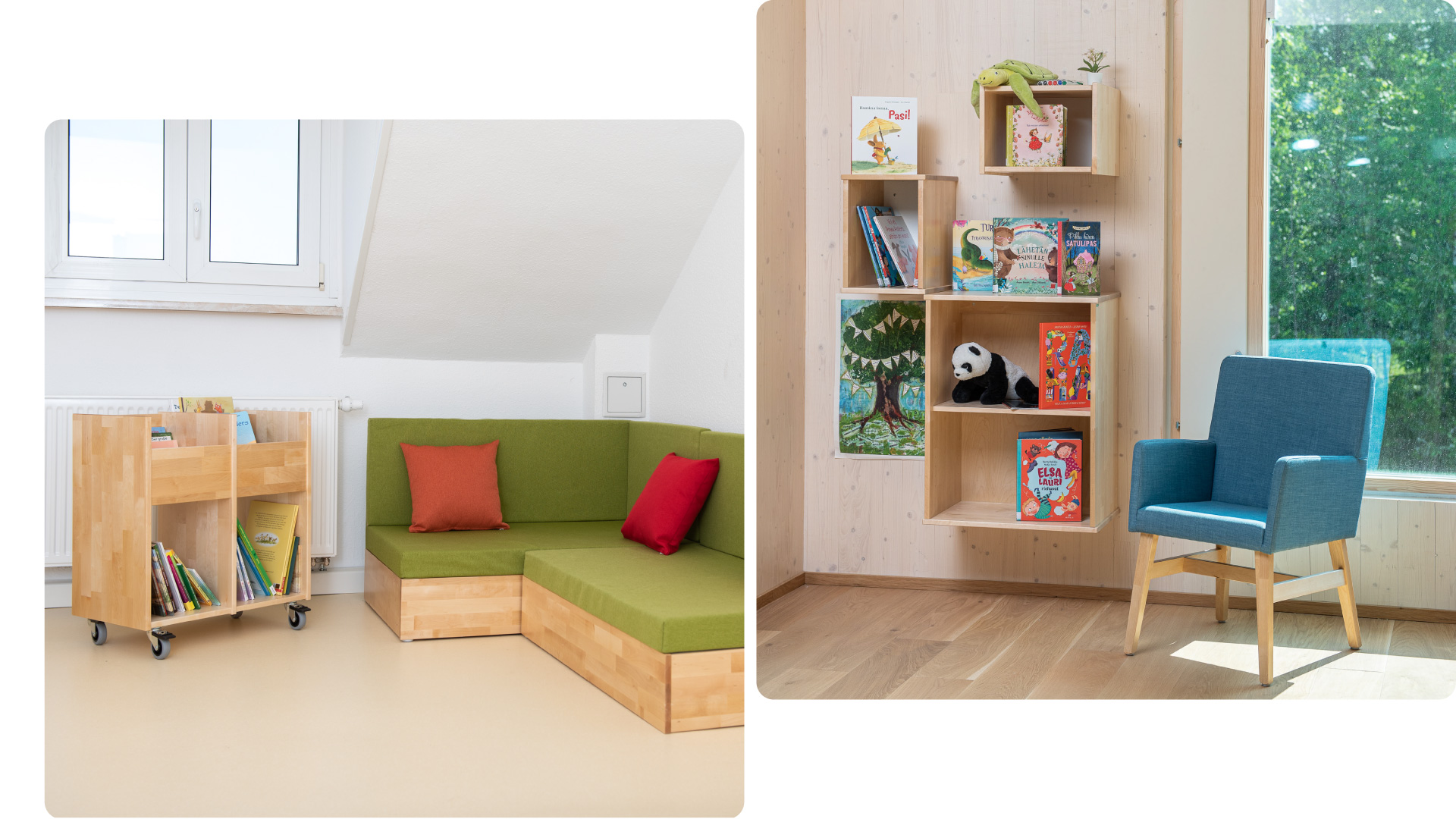 Before nap time, it’s nice to relax in a cozy reading corner. In the book cart, the books are easy to reach even for the smallest children, and their favorite fairy tale can be chosen in no time.