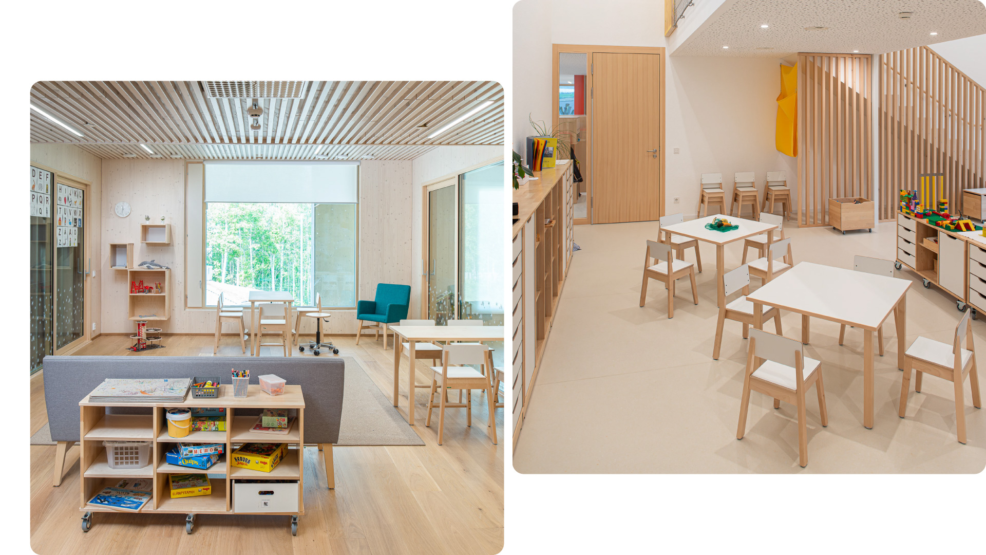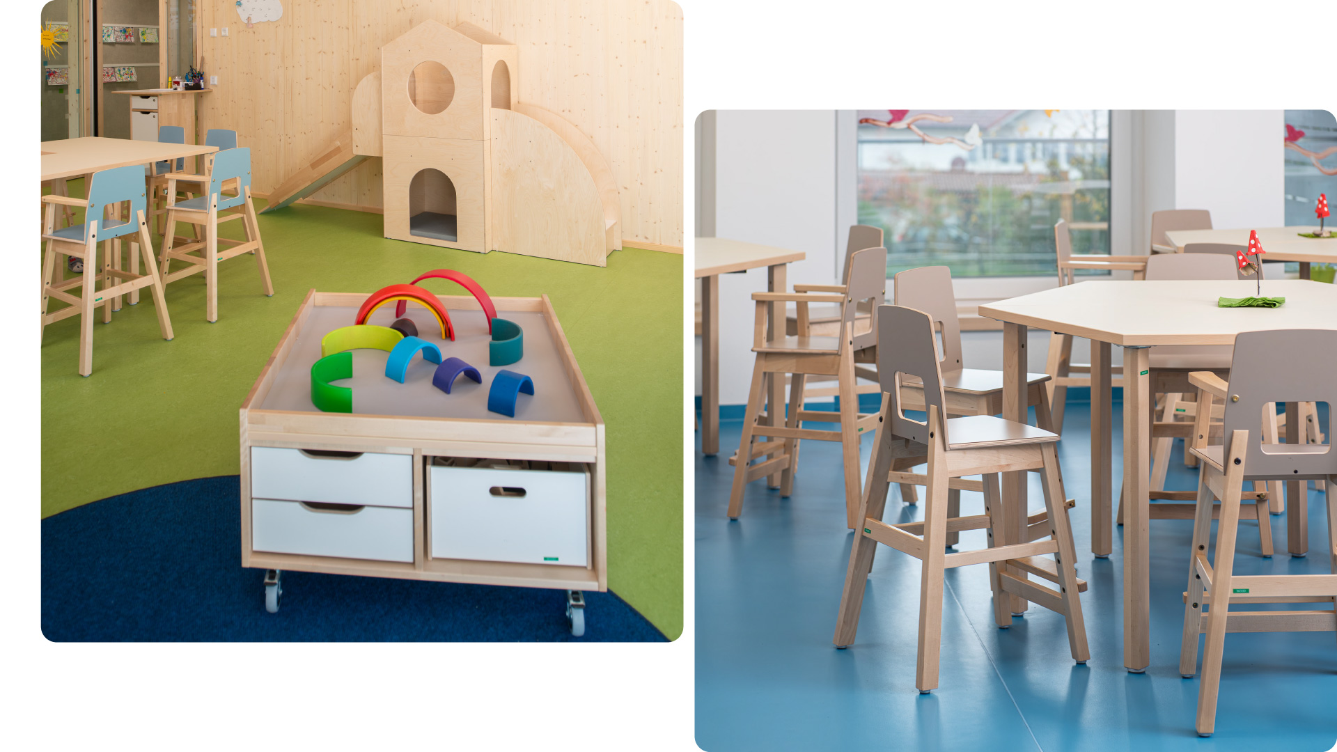 A room full of creativity and possibilities. In the group room for children aged 3 to 5, there is music, meals, shared learning, and laughter. The children discover themselves in the mirror – an experience that fills them with wonder. Thanks to the flexible furnishings, the room can be adapted to any activity in no time.