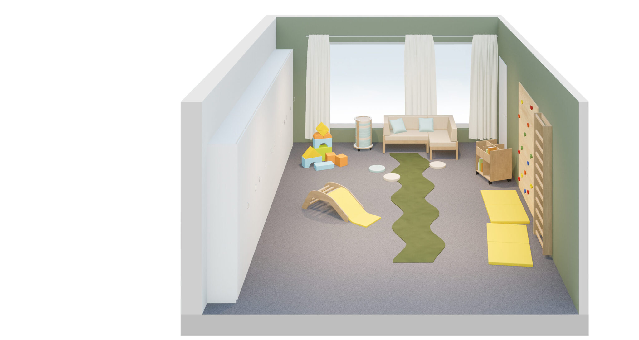 After active playtime, the equipment can easily be moved aside. The foldable wall-mounted bed cabinets open toward the center of the room without limiting the remaining space for toys and movement – everything designed for an optimally arranged daycare movement room.