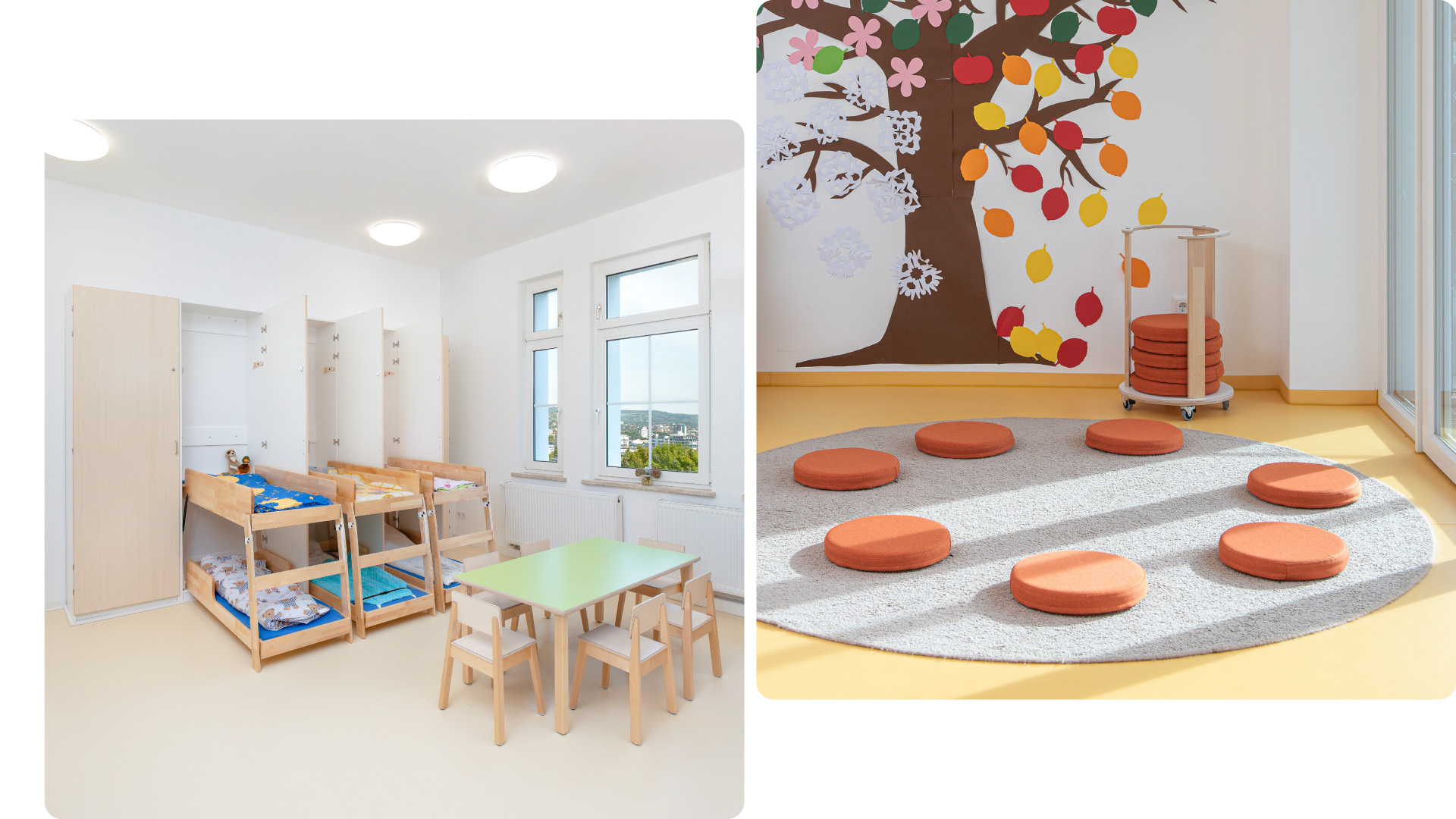 Before nap time, the daycare’s sleeping room transforms into a lively play zone or a cozy retreat for storytelling. Floor mats create space for group activities, while cushions, building blocks, and movement arches turn into imaginative little nests.