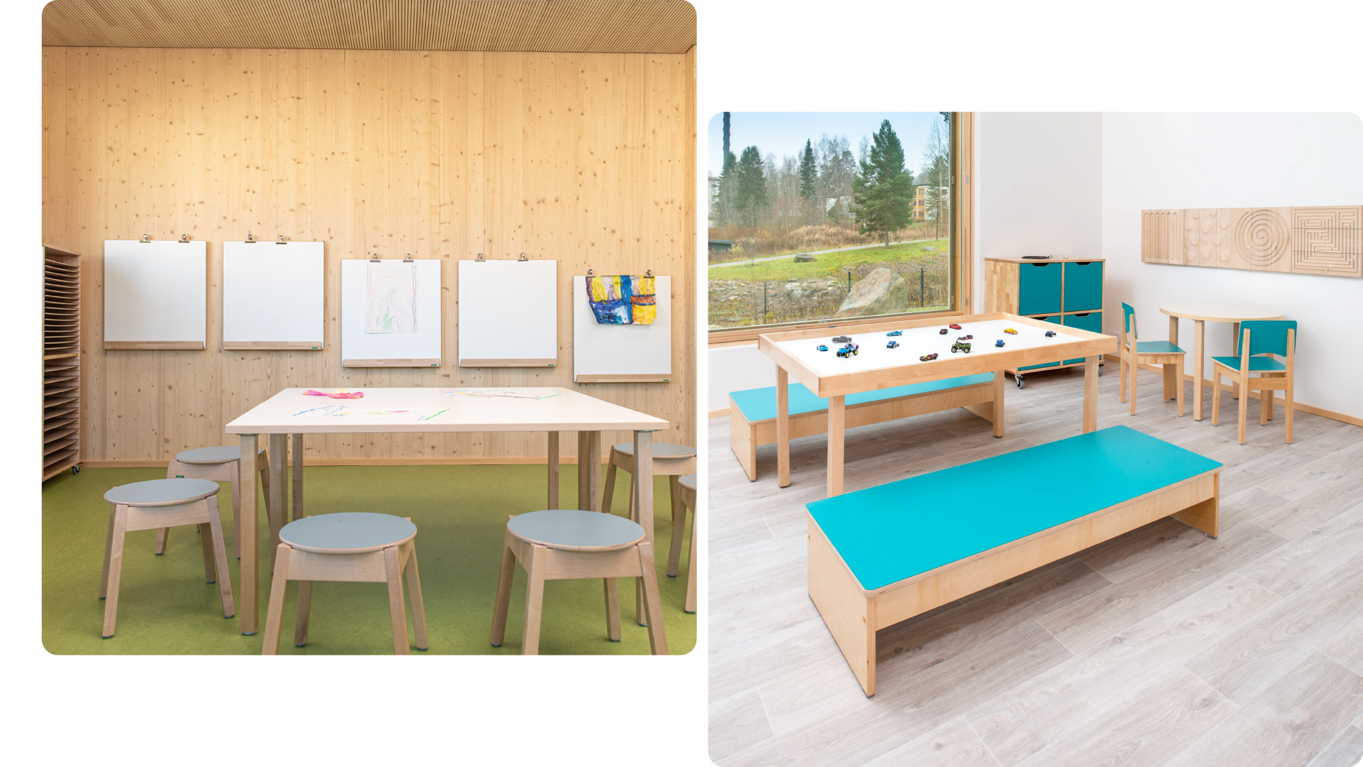 In this versatile preschool room, children care for plants, explore moss, stones, and autumn leaves, and learn about the continents through play. The creative space provides room for research projects, LEGO constructions, and free play.