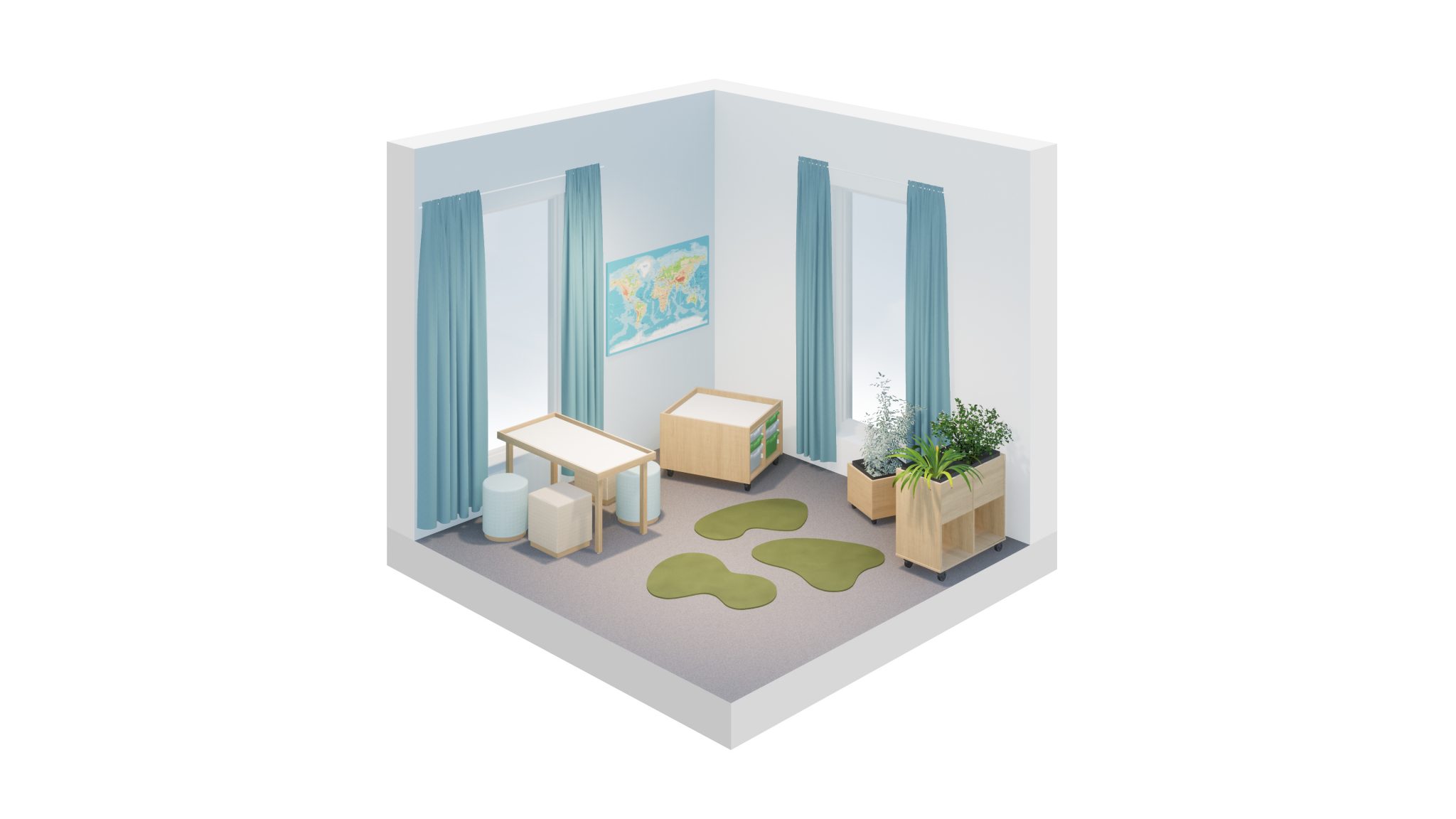 Noin 11 neliön huoneessa liikuteltavat kasvivaunut sekä rakentelupöytä varmistavat että huoneessa on tarpeeksi tilaa eri aktiviteeteille ja tarvittaessa vaunuja voidaan siirtää sivuun.