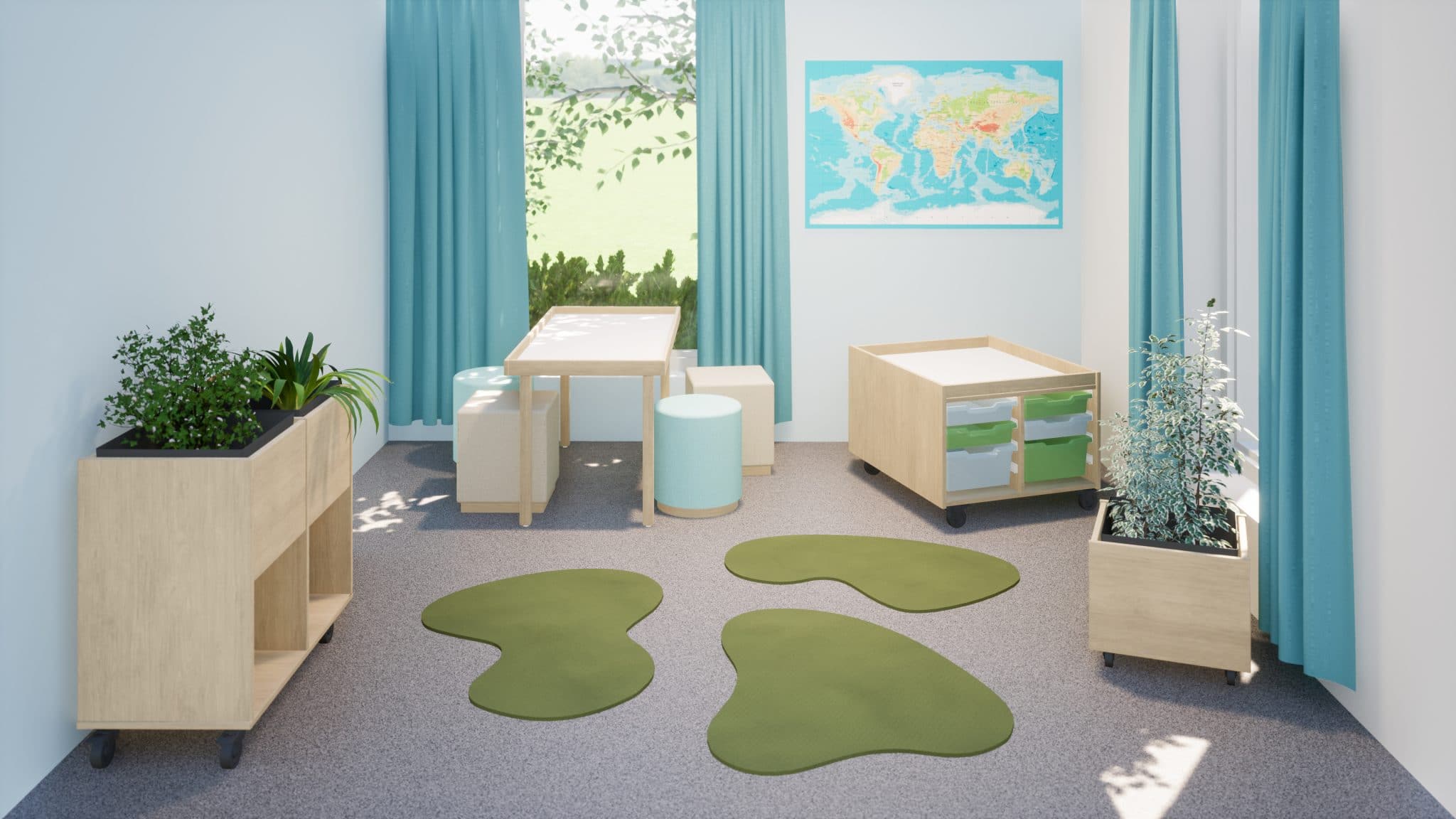 Tilan säilytysratkaisuista huolehtii rakentelupöytä, jonka molemmin puolin avautuvat muovilaatikot täyttyvät leluista ja palikoista. Kasvivaunun alaosan lokerot säilövät näyttävimmät lelut näkösälle.