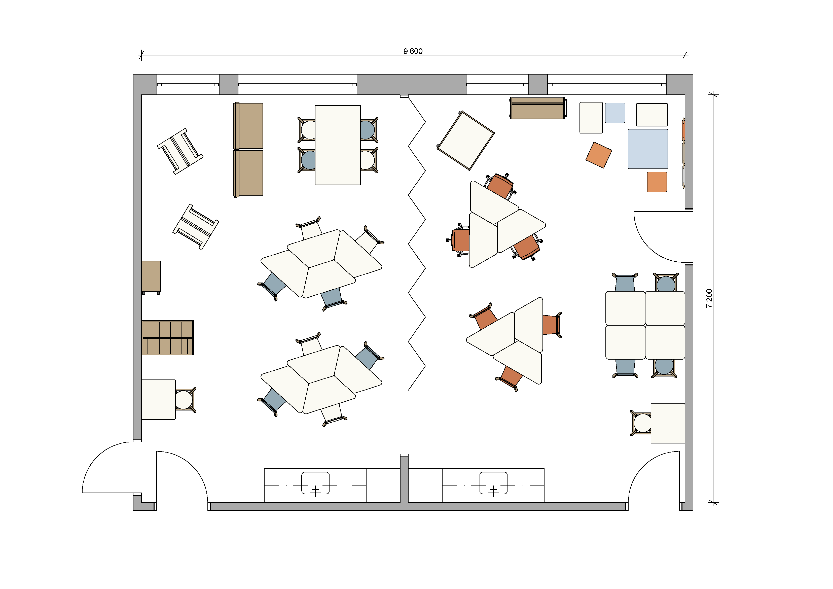 Muotopöydät mahdollistavat tilan ryhmittelyn pari-, ryhmä-, tai yksiötyöskentelyyn tai kokonaan isompiin pöytäryhmiin. Väliseinällä kahtia jaettu lähes 10 metriä pitkä tila saadaan yhdistettyä yhdeksi tilaksi ja pöytäryhmät jäävät valmiiksi keskelle tilaa.