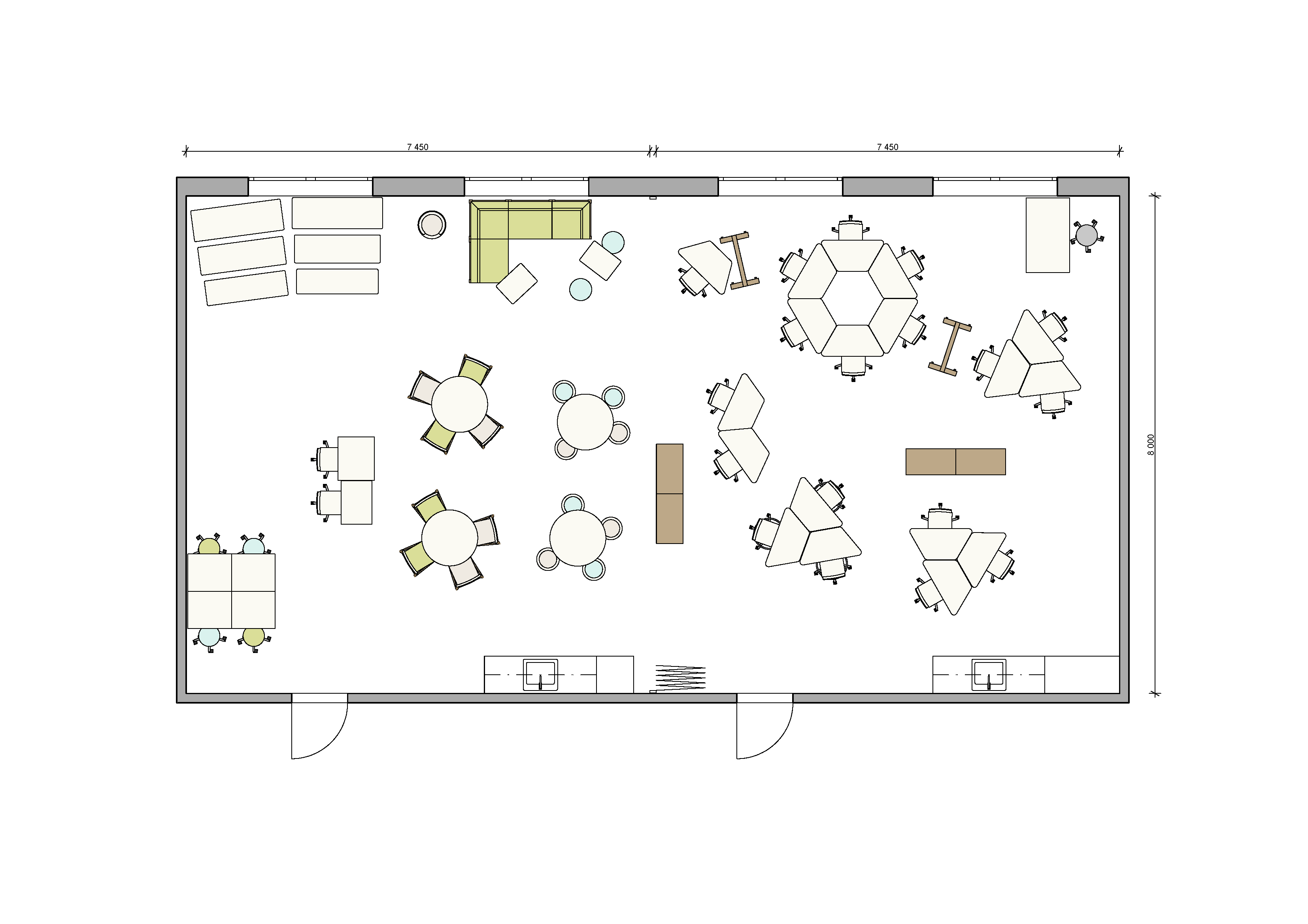 Muotopöydät siirtyvät helposti useaan eri asetelmaan yksilö-, pari- ja ryhmätyöskentelyä varten. Seinän vierelle taittuvat työpisteet tuovat lisäpaikkoja tarvittaessa. Liikuteltavilla sermeillä voi jakaa tilaa ja parantaa akustiikkaa.