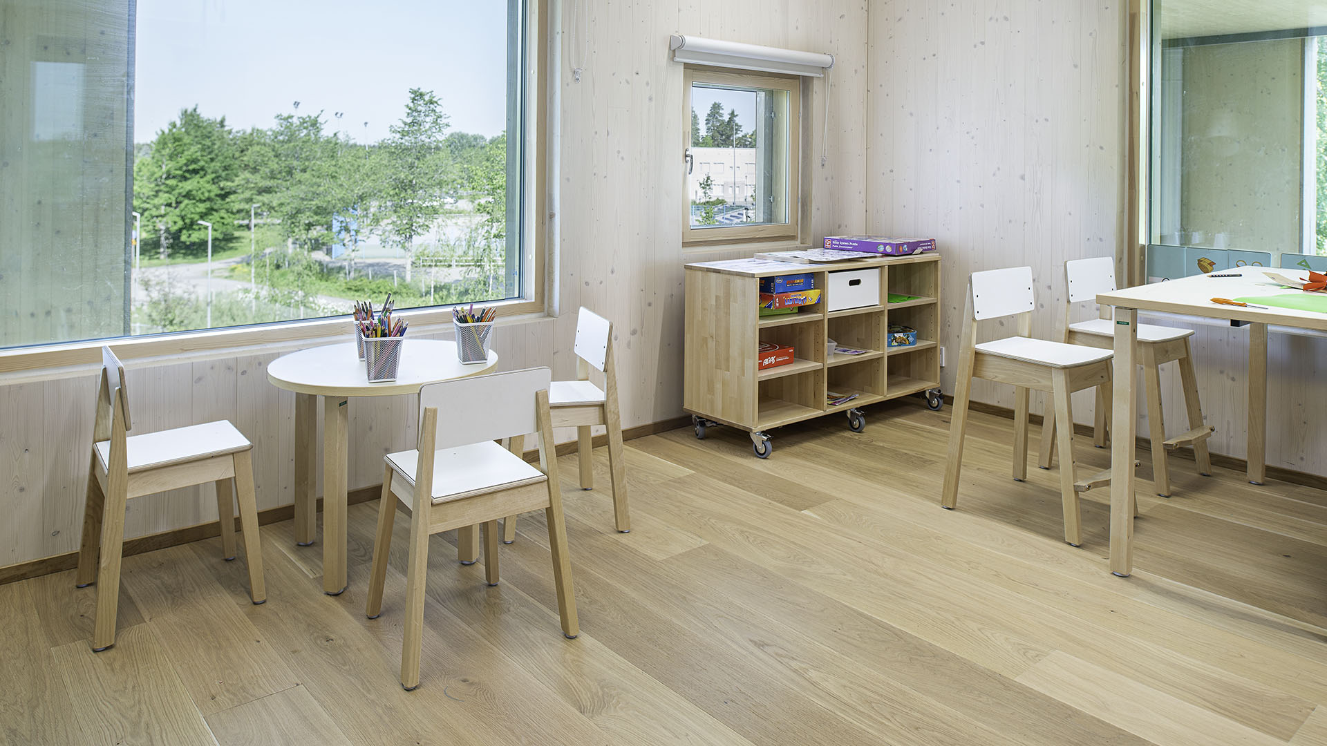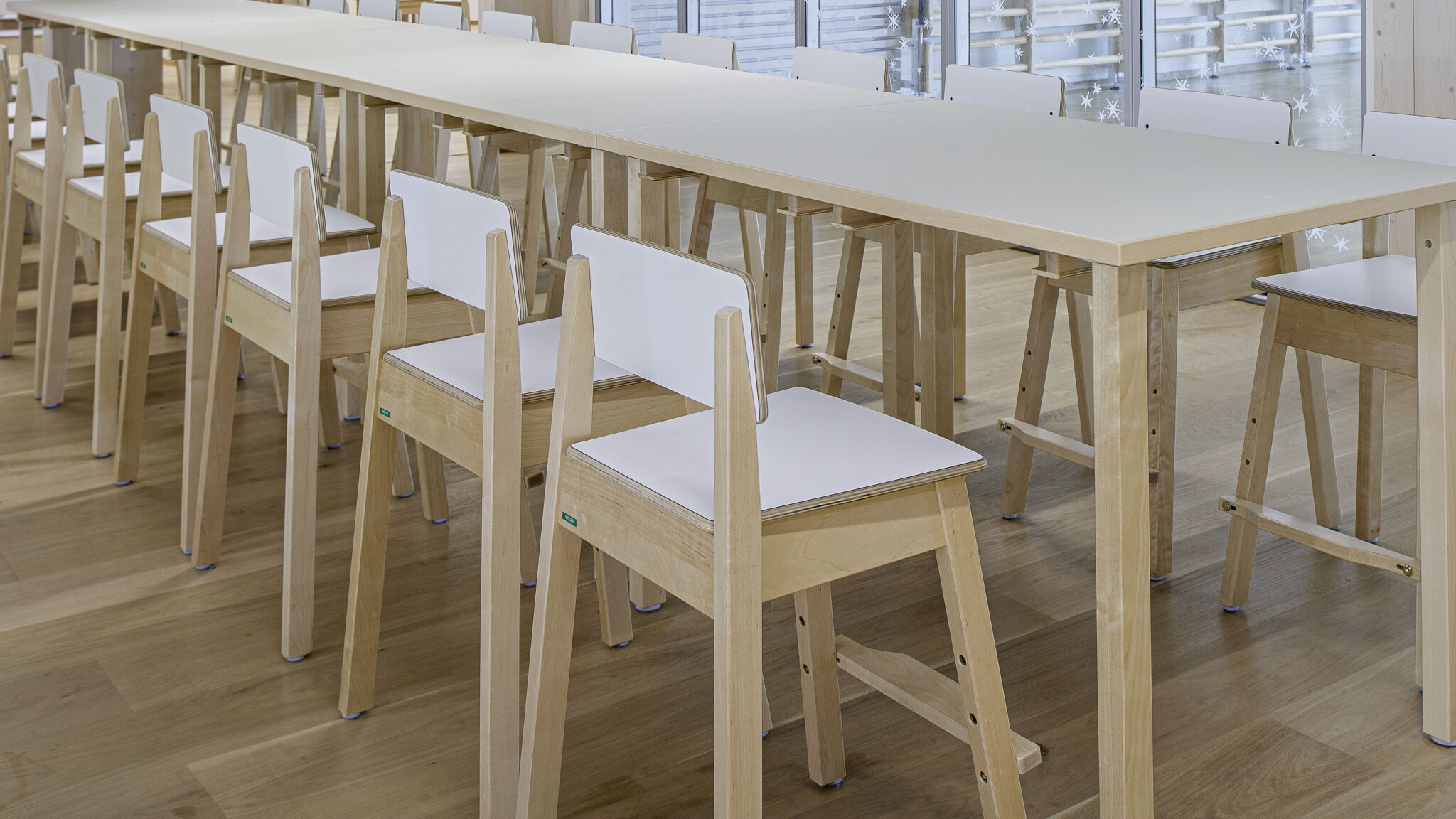 Puuntuoksuisen päiväkodin sisätilat on kalustettu rakennuksen teemaan ja arkkitehtuuriin sopivilla Woodi-päiväkotimalliston massiivipuukalusteilla. Päiväkodista löytyy Onni-tuoleja ja -säilyttimiä, rakentelupöytiä, leikkikeittiöitä… Kalusteiden luonnollisen värinen massiivikoivu yhdessä vaaleiden pintamateriaalien kanssa muodostaa yhtenevän kokonaisuuden rakennuksen puupintojen kanssa. Ikkunoista avautuvan ympäröivän luonnon lisäksi tilojen väripilkkuna toimivat pehmeät verhoillut kalusteet lasipinnoissa esiintyvää Martta Wendelinin taidetta unohtamatta.