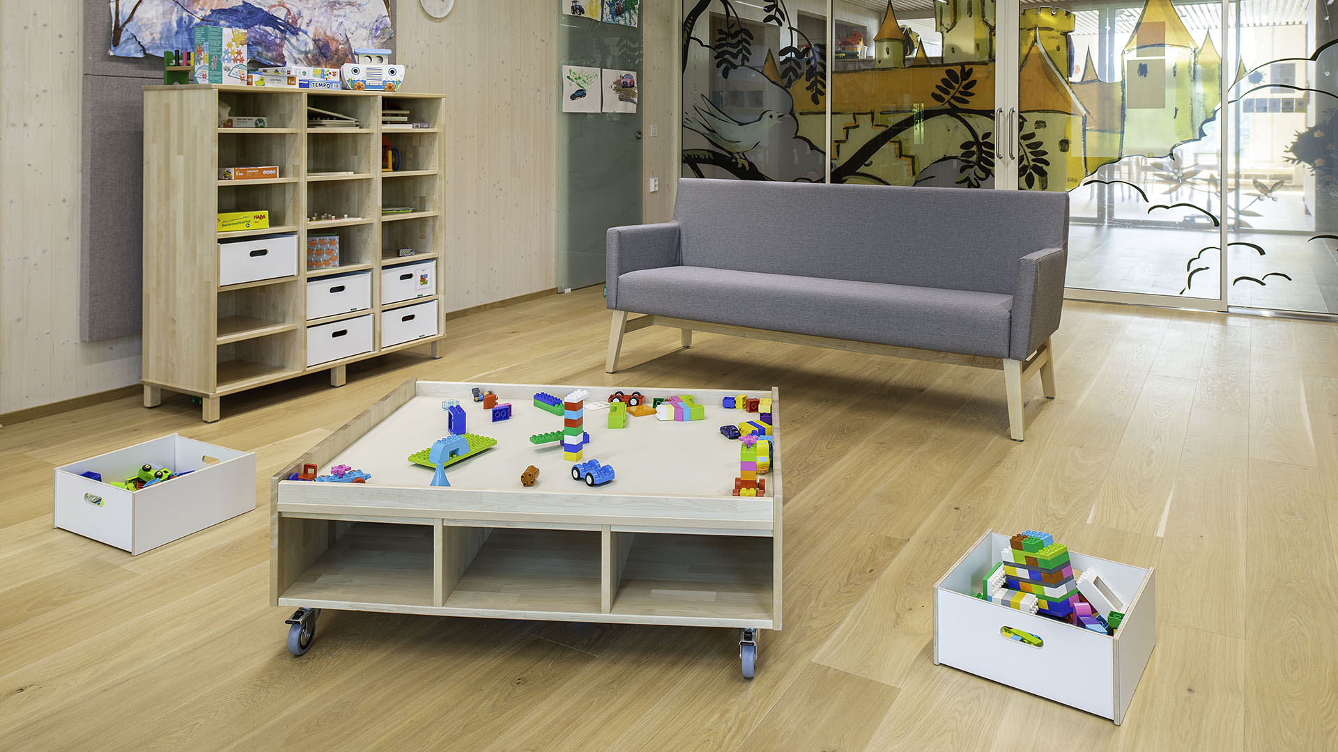 Harmoninen tunnelma välittyy tilasta toiseen kuljettaessa. Kalusteiden yhtenäinen muotokieli sekä värimaailma viimeistelee kokonaisuuden. Väljät ja monikäyttöiset tilat muunneltavine kalusteineen mahdollistavat upeat puitteet päiväkodille, jonka tavoitteena on edistää lasten hyvinvointia, kehittymistä ja oppimista.